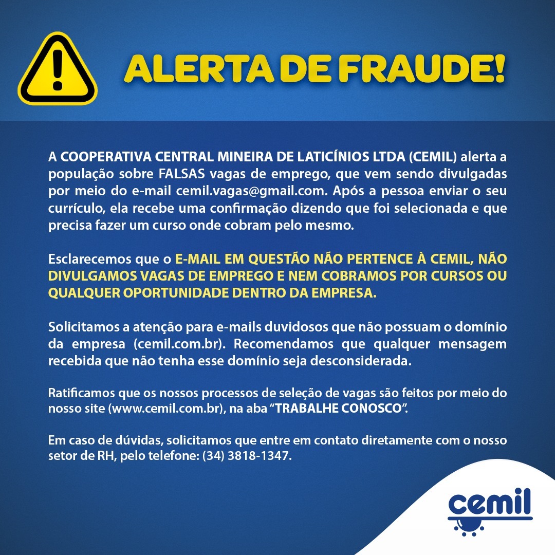 A COOPERATIVA CENTRAL MINEIRA DE LATICÍNIOS LTDA (CEMIL) alerta a população sobre FALSAS vagas de emprego que vem sendo divulgadas por meio do e-mail cemil.vagas@gmail.com.